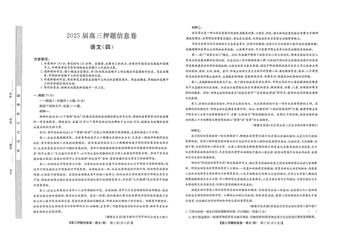 九师联盟2025届高三押题信息卷(四)语文试卷(含答案).pdf