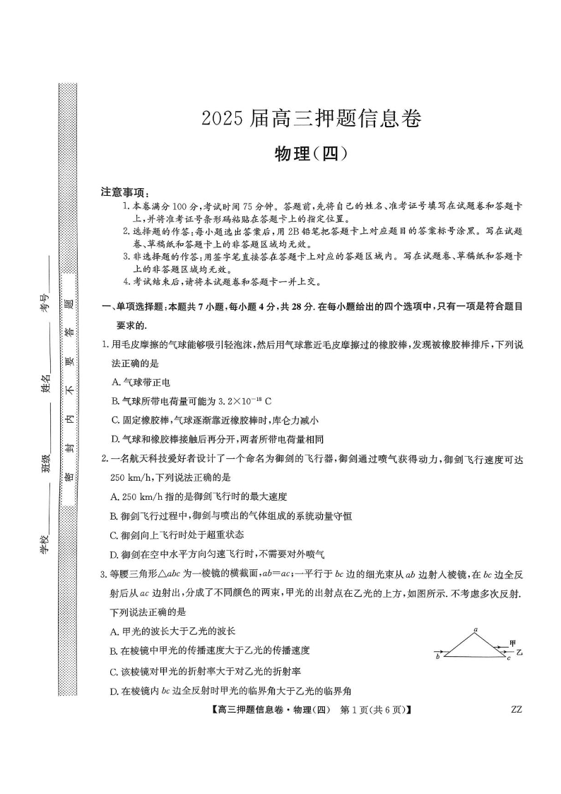 九师联盟2025届高三押题信息卷(四)物理试卷(含答案).pdf