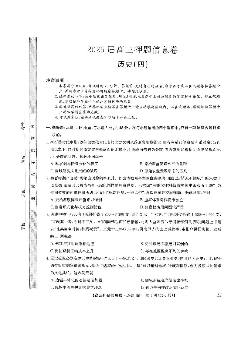 九师联盟2025届高三押题信息卷(四)历史试卷(含答案).pdf