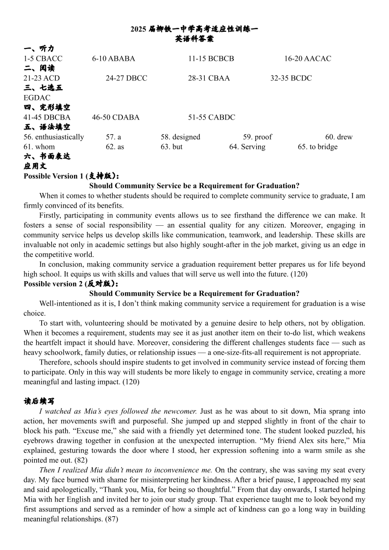柳铁一中2025届高考适应性训练 英语答案.pdf