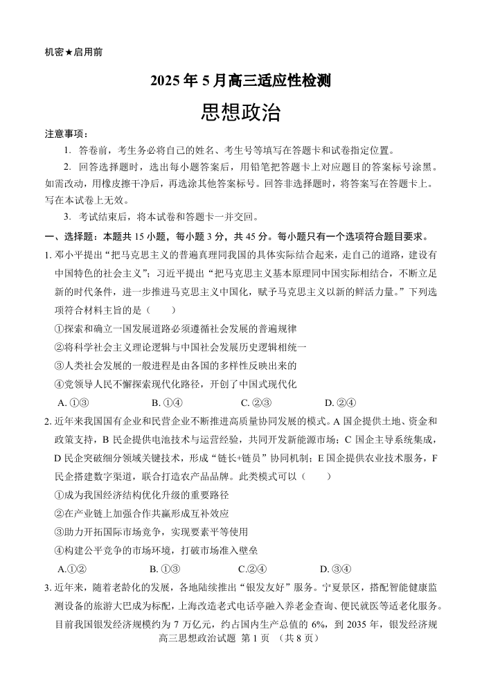 山东师范大学附属中学2025年5月高三适应性检测 政治.pdf
