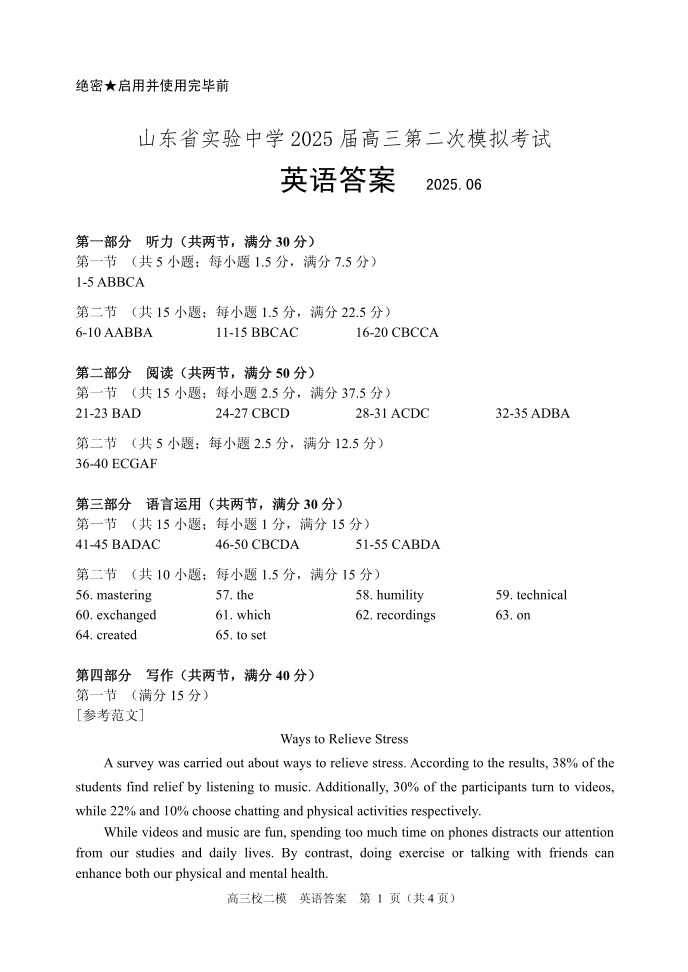 山东省实验中学2025届高三6月第二次模拟考试 英语答案.pdf