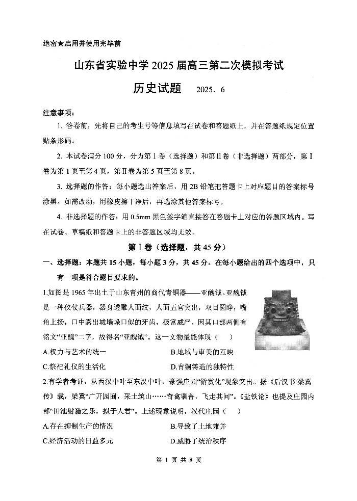 山东省实验中学2025届高三6月第二次模拟考试 历史.pdf