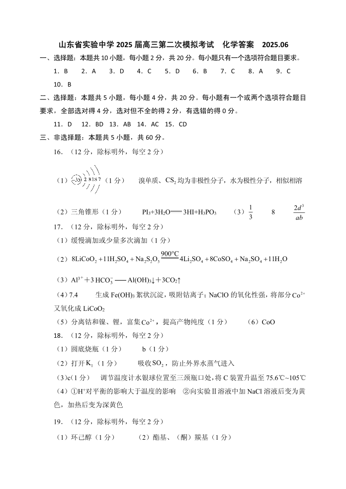 山东省实验中学2025届高三6月第二次模拟考试 化学答案.pdf