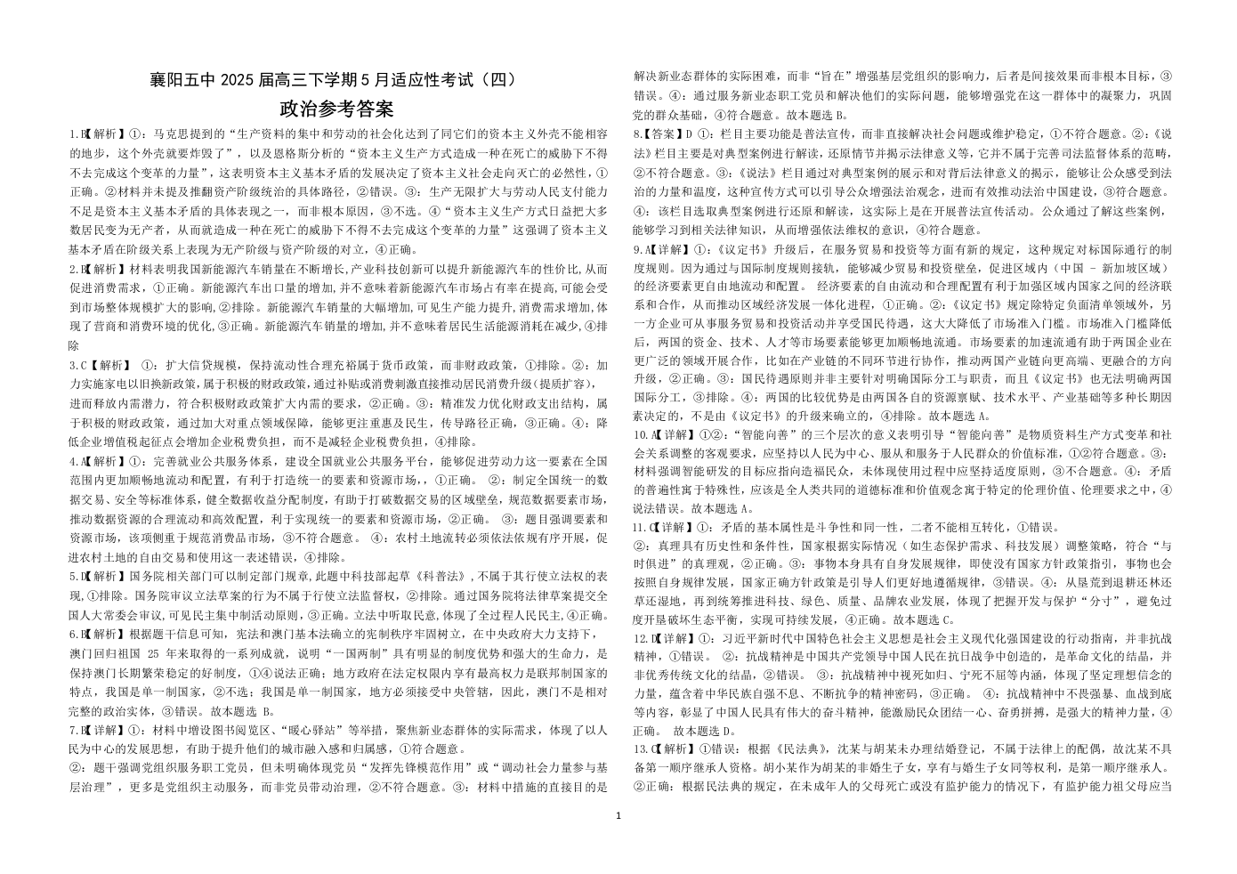 湖北省襄阳五中2025届高三下学期5月适应性考试(四)政治答案.docx