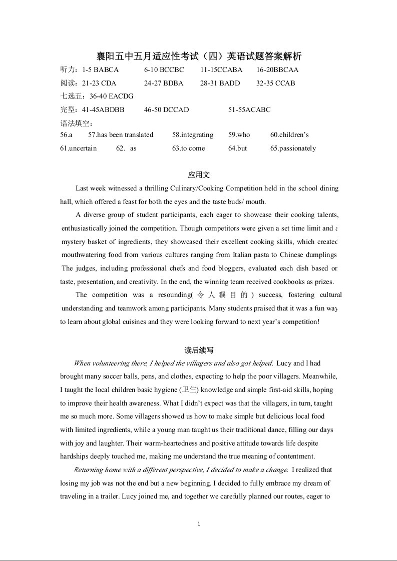湖北省襄阳五中2025届高三下学期5月适应性考试(四)英语答案.docx