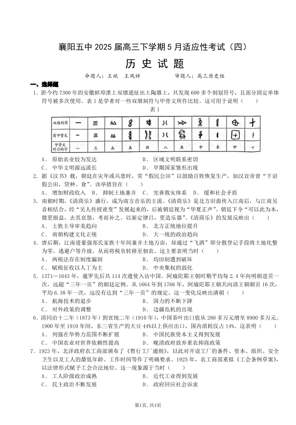 湖北省襄阳五中2025届高三下学期5月适应性考试(四)历史.pdf