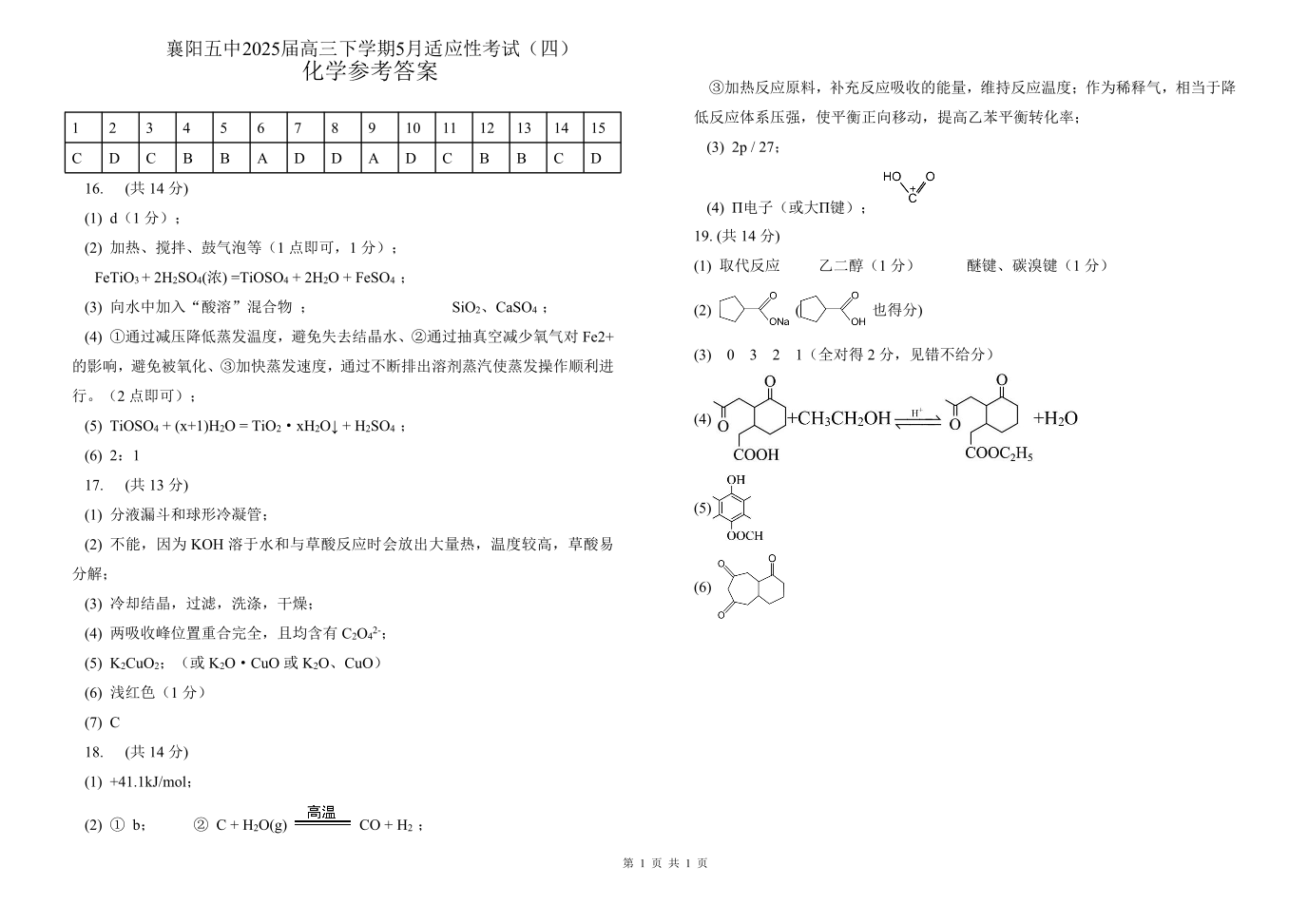 湖北省襄阳五中2025届高三下学期5月适应性考试(四)化学答案.pdf