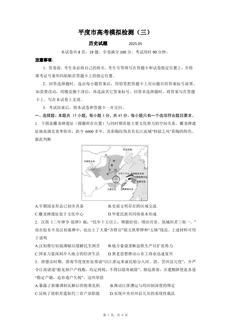 平度市2025年高考模拟检测(三)历史及答案.pdf