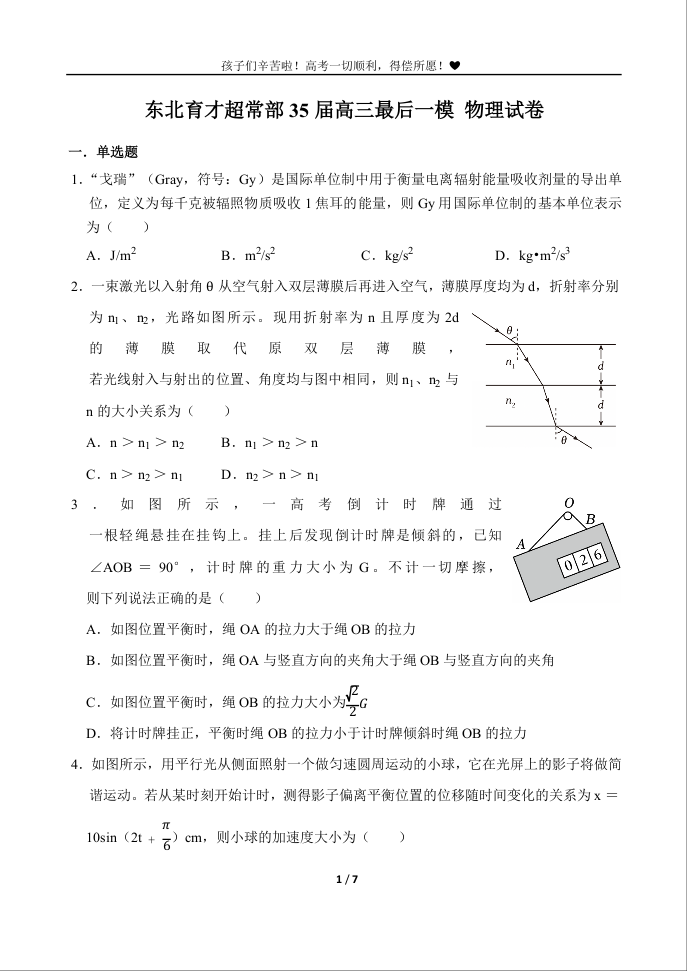 东北育才超常部35届高三最后一模 物理.docx
