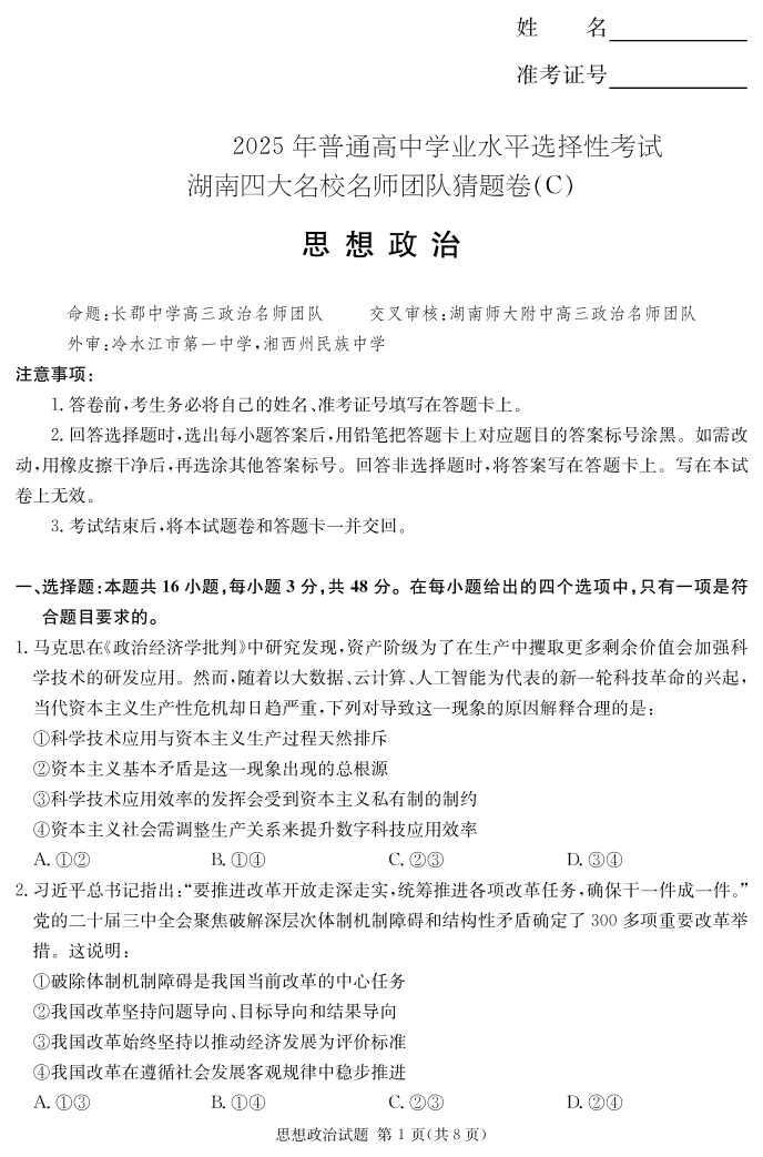 湖南省四大名校名师团队猜题卷(C)政治.pdf