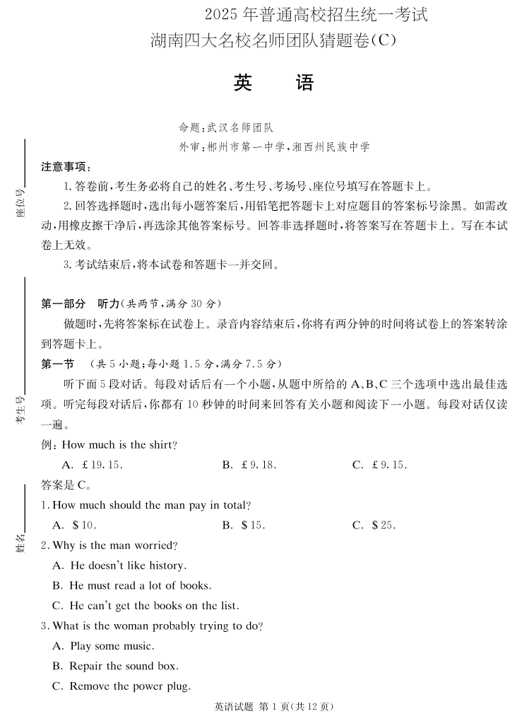 湖南省四大名校名师团队猜题卷(C)英语.pdf
