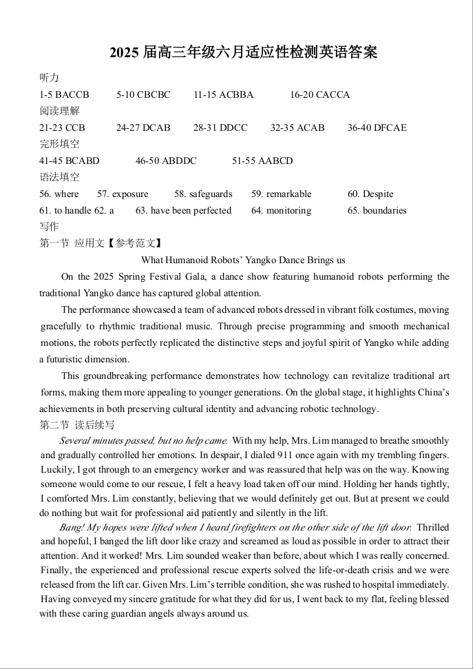 湖北省荆州市沙市中学2025届高三年级六月适应性检测 英语答案.docx