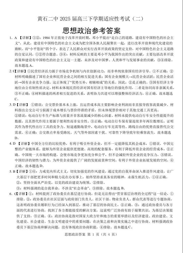 黄石二中2025届高三下学期适应性考试(二)政治答案.docx