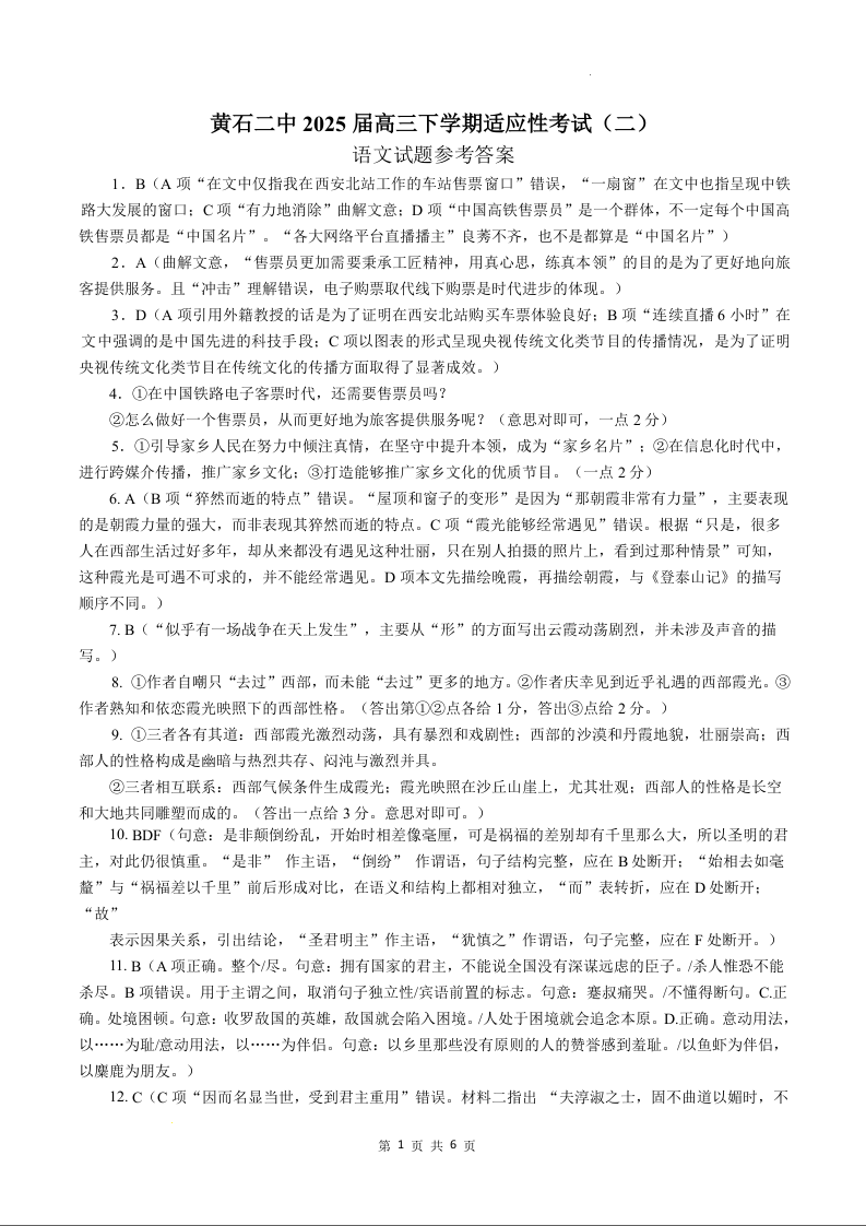 黄石二中2025届高三下学期适应性考试(二)语文答案.docx