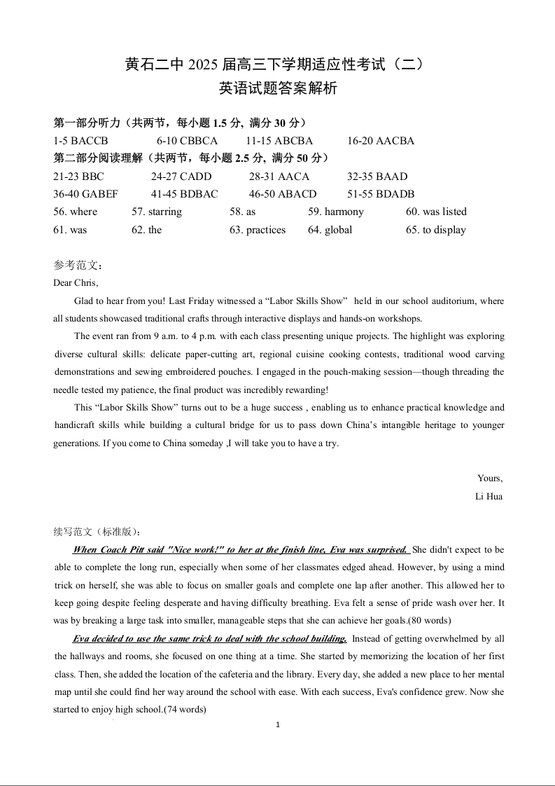 黄石二中2025届高三下学期适应性考试(二)英语答案.docx
