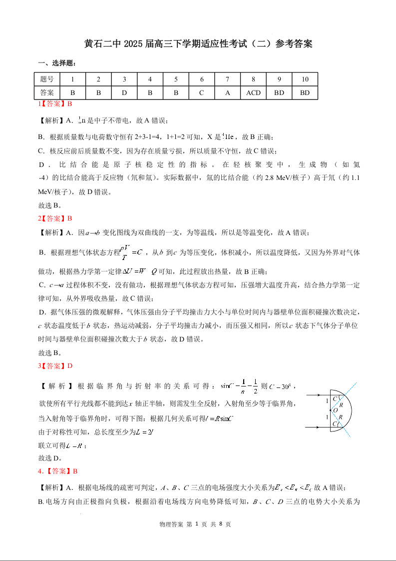黄石二中2025届高三下学期适应性考试(二)物理答案.docx