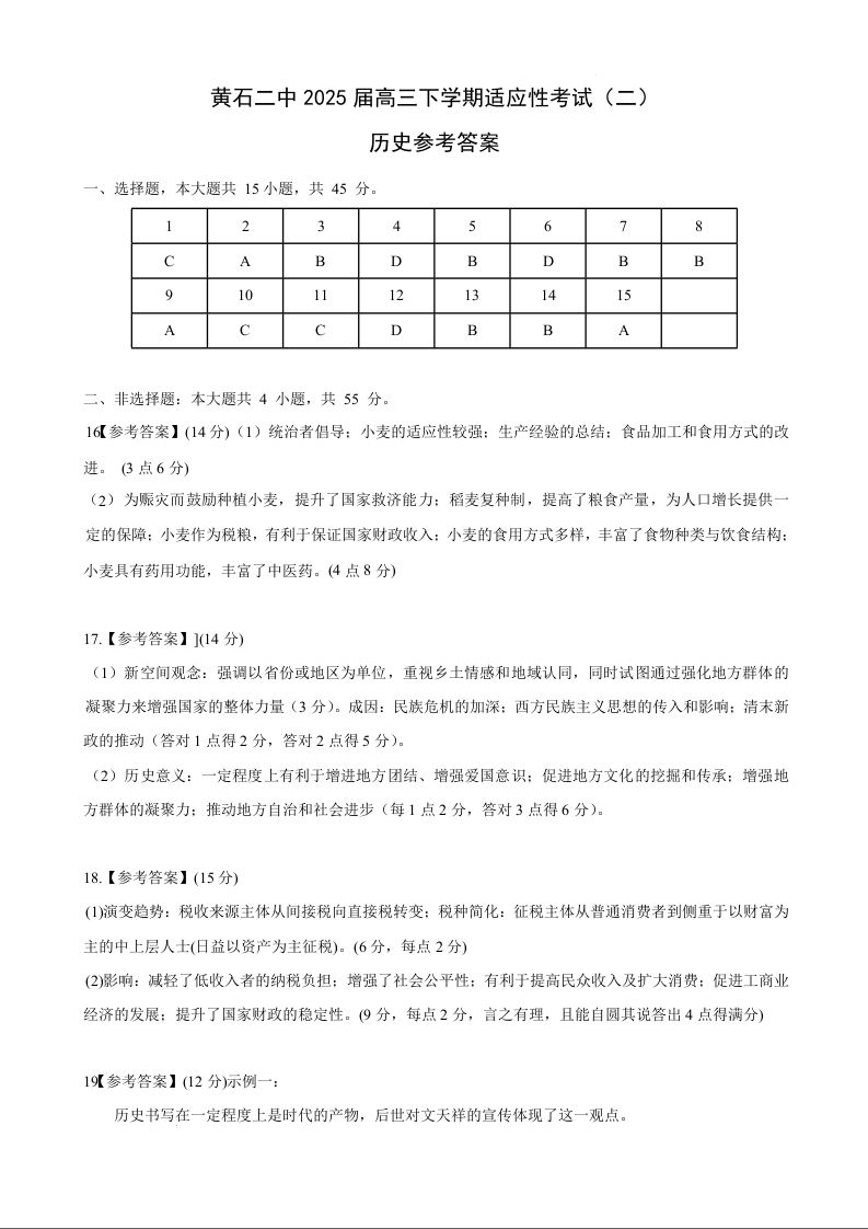 黄石二中2025届高三下学期适应性考试(二)历史答案.docx