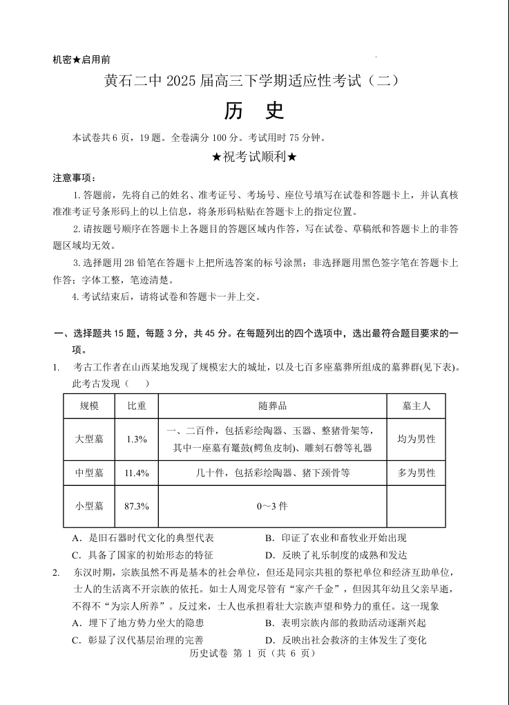 黄石二中2025届高三下学期适应性考试(二)历史.docx