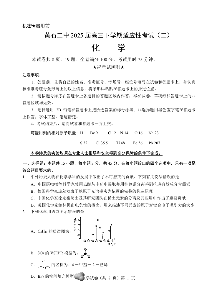 黄石二中2025届高三下学期适应性考试(二)化学.docx