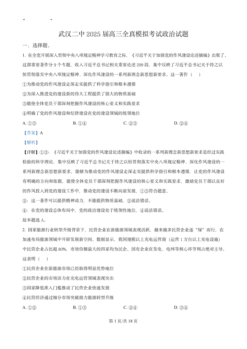 武汉二中2025届高三年级全真模拟考 政治参考答案.pdf