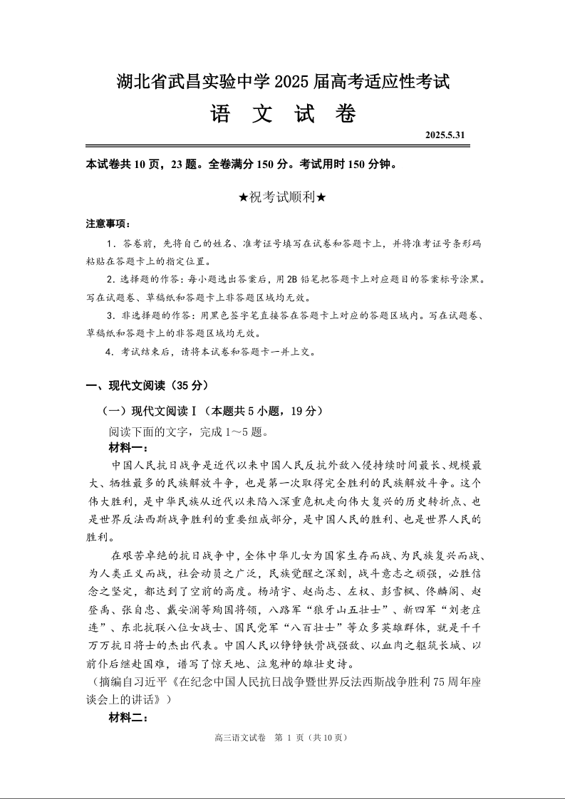 湖北省武昌实验中学2025届高考适应性考试 语文.docx