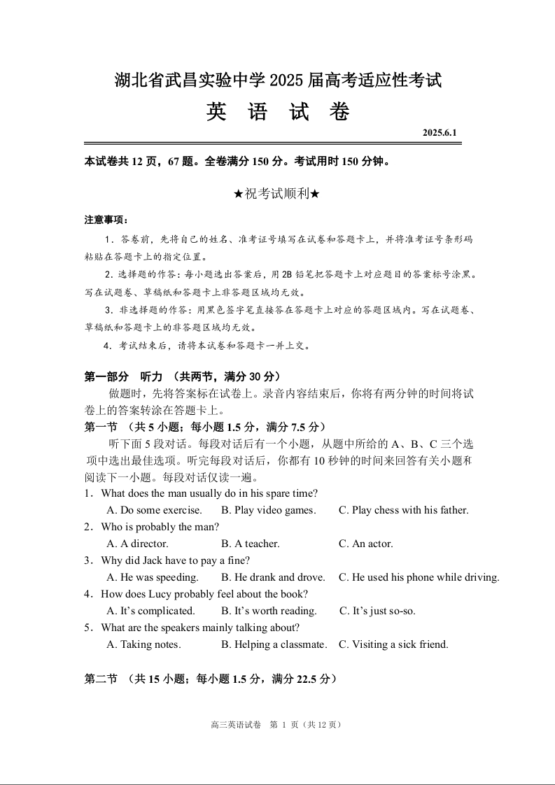 湖北省武昌实验中学2025届高考适应性考试 英语.docx