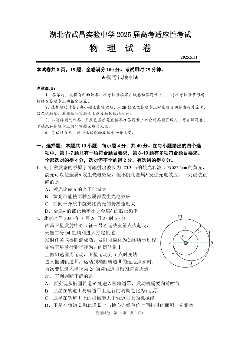 湖北省武昌实验中学2025届高考适应性考试 物理.docx