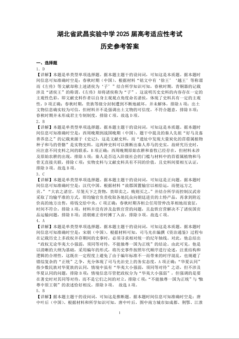 湖北省武昌实验中学2025届高考适应性考试 历史参考答案.docx