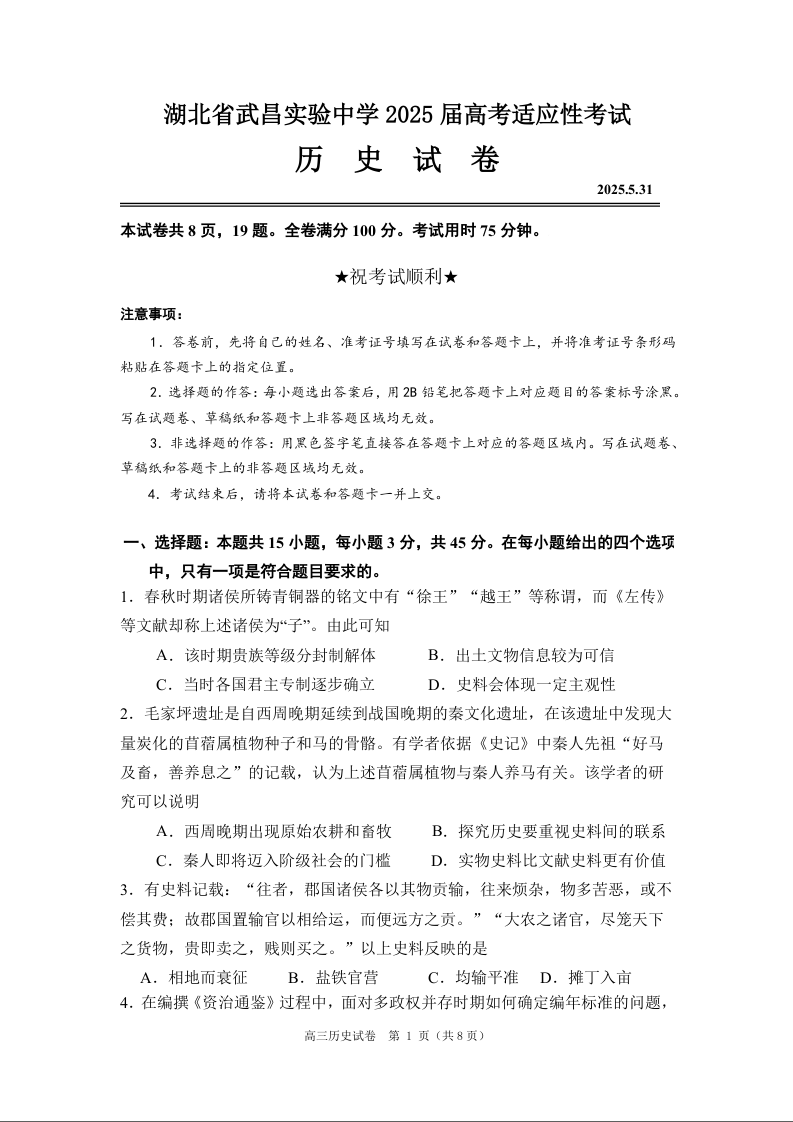 湖北省武昌实验中学2025届高考适应性考试 历史.docx