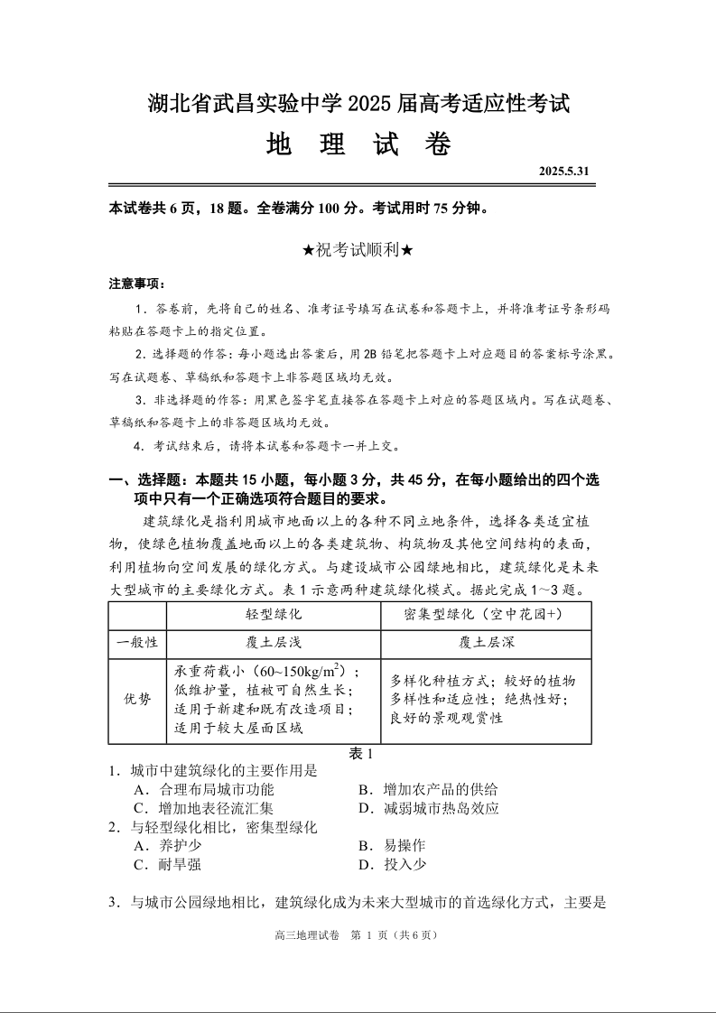 湖北省武昌实验中学2025届高考适应性考试 地理.docx
