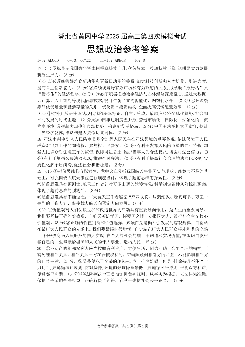 湖北省黄冈中学2025届高三第四次模拟考试 政治答案.pdf