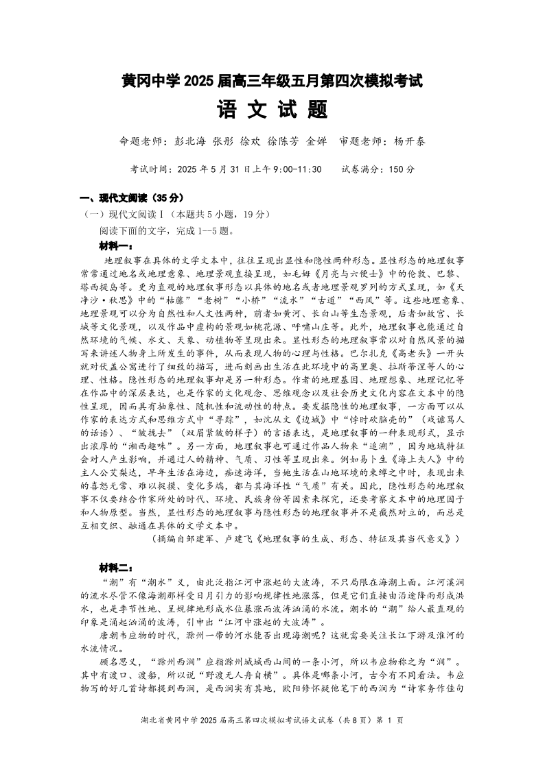 湖北省黄冈中学2025届高三第四次模拟考试 语文.pdf