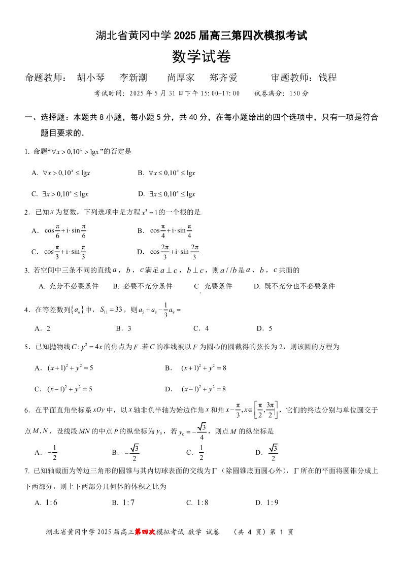 湖北省黄冈中学2025届高三第四次模拟考试 数学.pdf