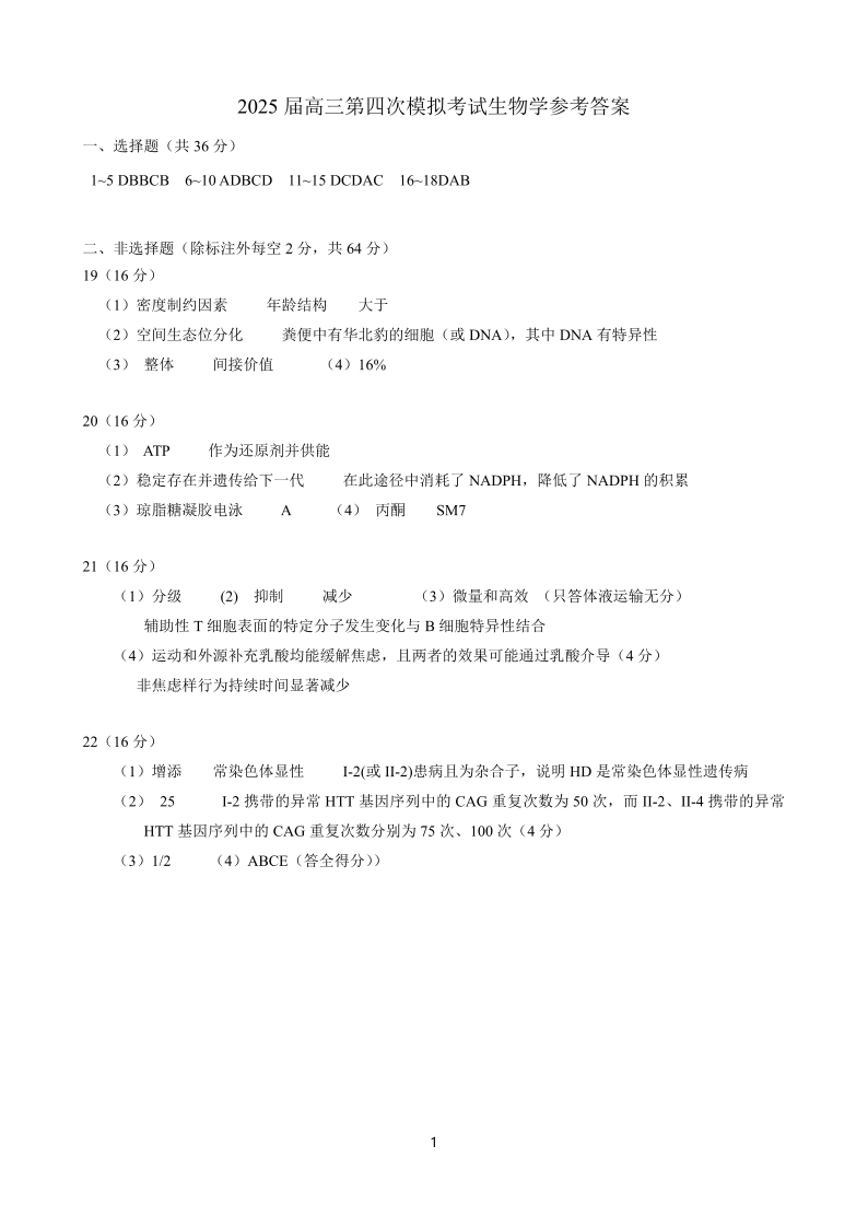 湖北省黄冈中学2025届高三第四次模拟考试 生物答案.pdf