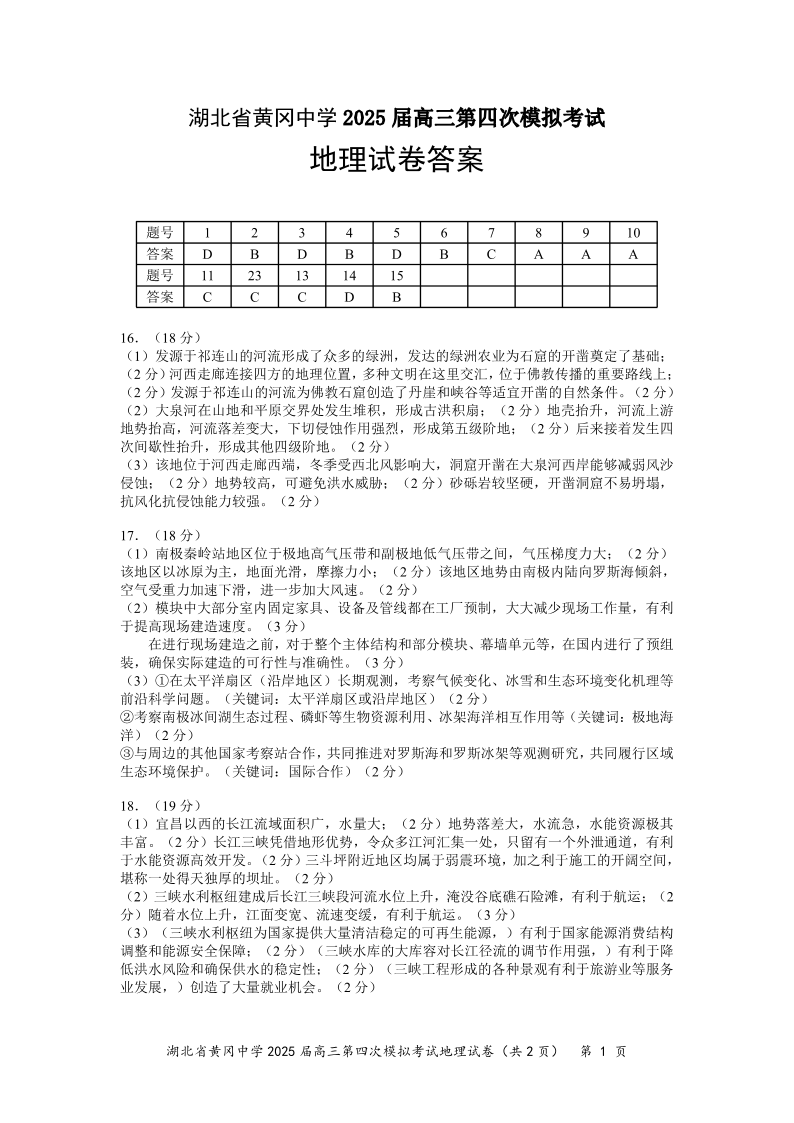 湖北省黄冈中学2025届高三第四次模拟考试 地理答案.pdf