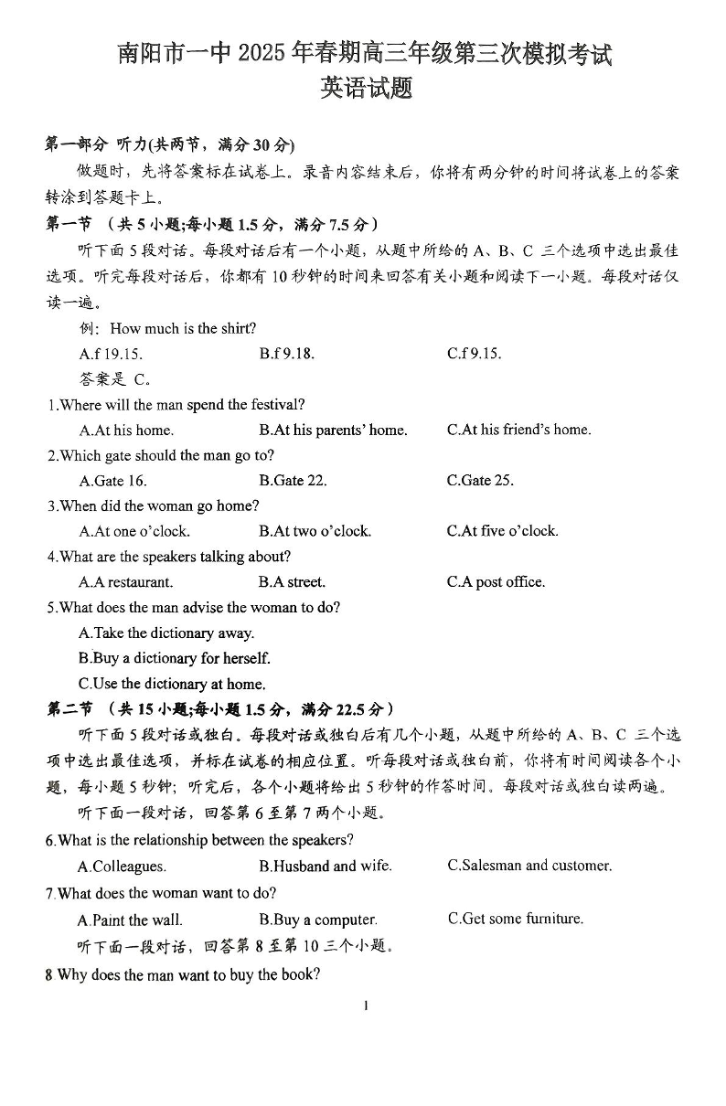 南阳市第一中2025年春期高三年级第三次模拟考试 英语试卷(含解析).pdf
