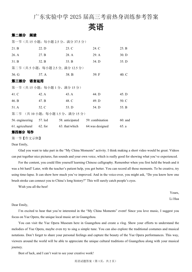 广东实验中学2025届高三考前热身训练 英语参考答案.pdf