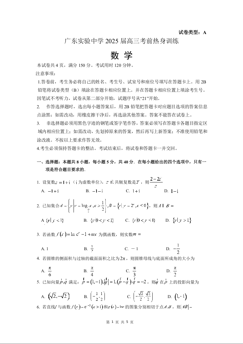 广东实验中学2025届高三考前热身训练 数学.docx