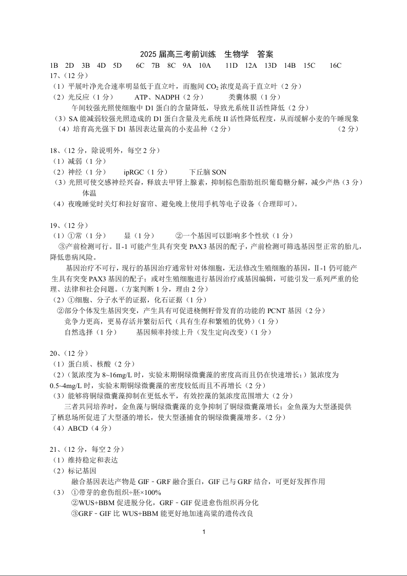 广东实验中学2025届高三考前热身训练 生物参考答案.docx