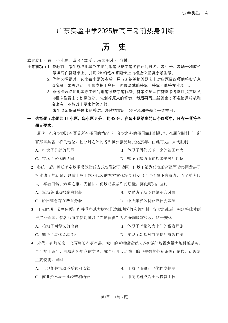 广东实验中学2025届高三考前热身训练 历史.pdf
