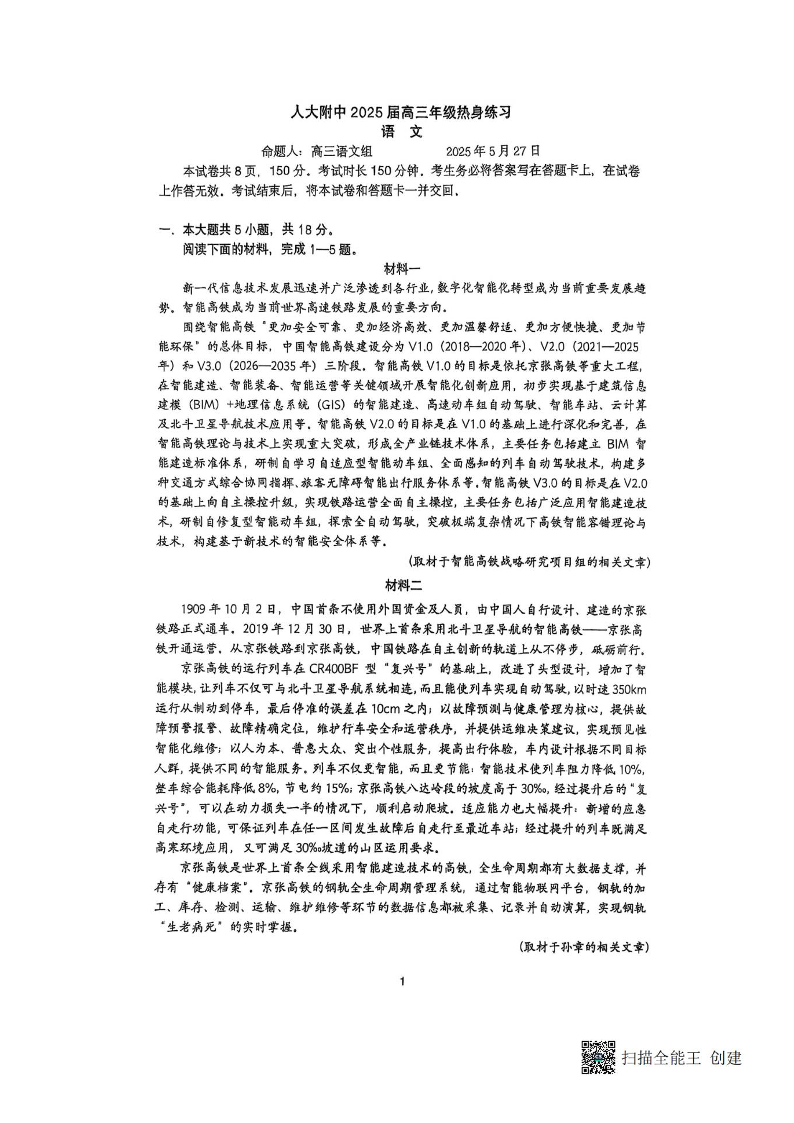 北京人大附中2025届高三考前适应性练习 语文试题(含答案).pdf