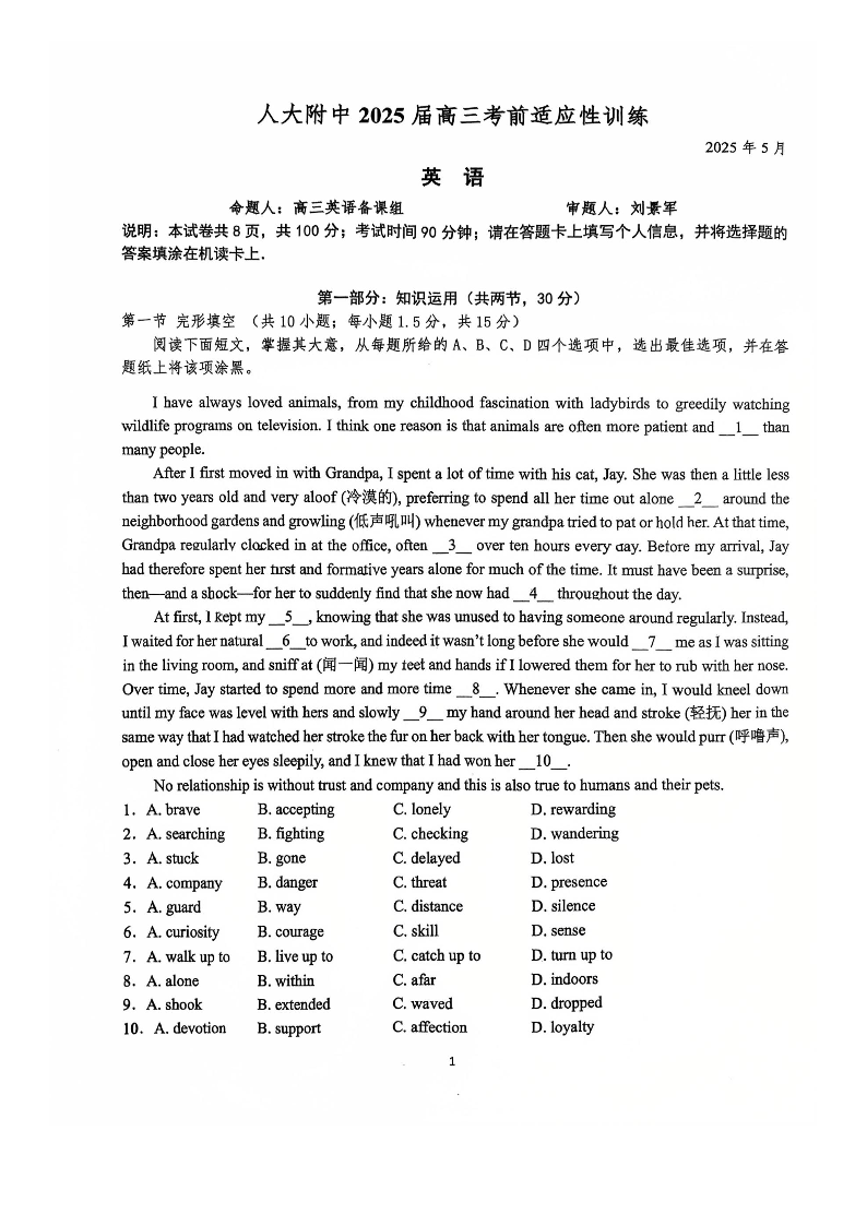 北京人大附中2025届高三考前适应性练习 英语试题(含答案).pdf
