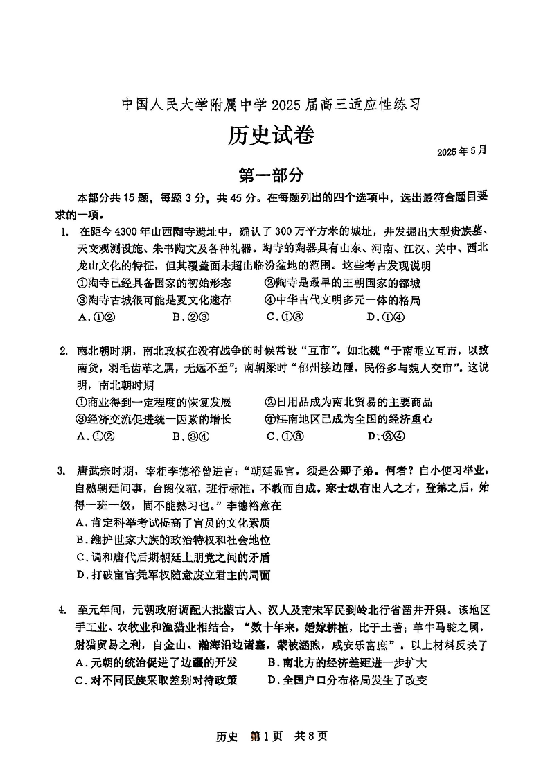 北京人大附中2025届高三考前适应性练习 历史试题(含答案).pdf