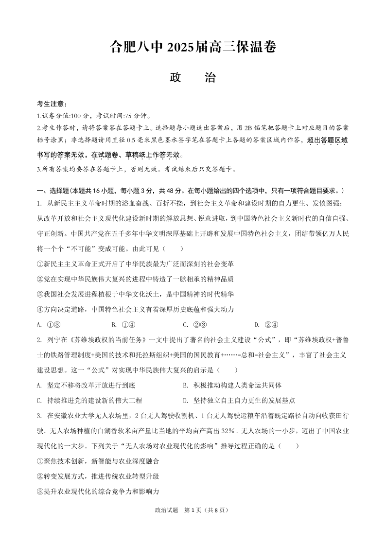 合肥八中2025届高三保温卷 政治.pdf
