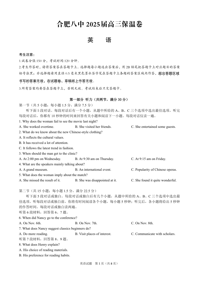 合肥八中2025届高三保温卷 英语.pdf