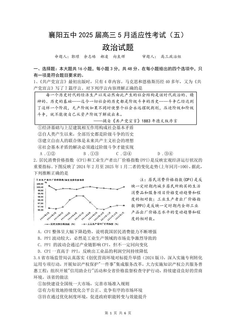 襄阳五中2025届高三下学期5月适应性考试(五)政治.pdf