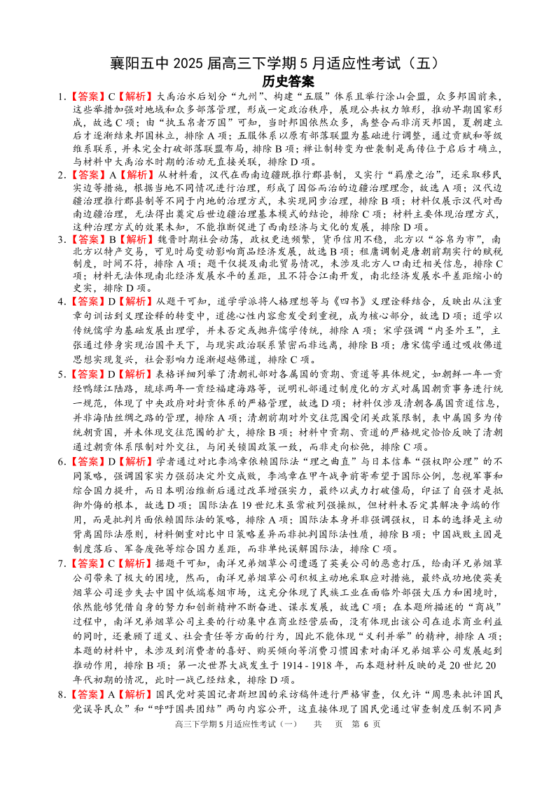 襄阳五中2025届高三下学期5月适应性考试(五)历史答案.pdf