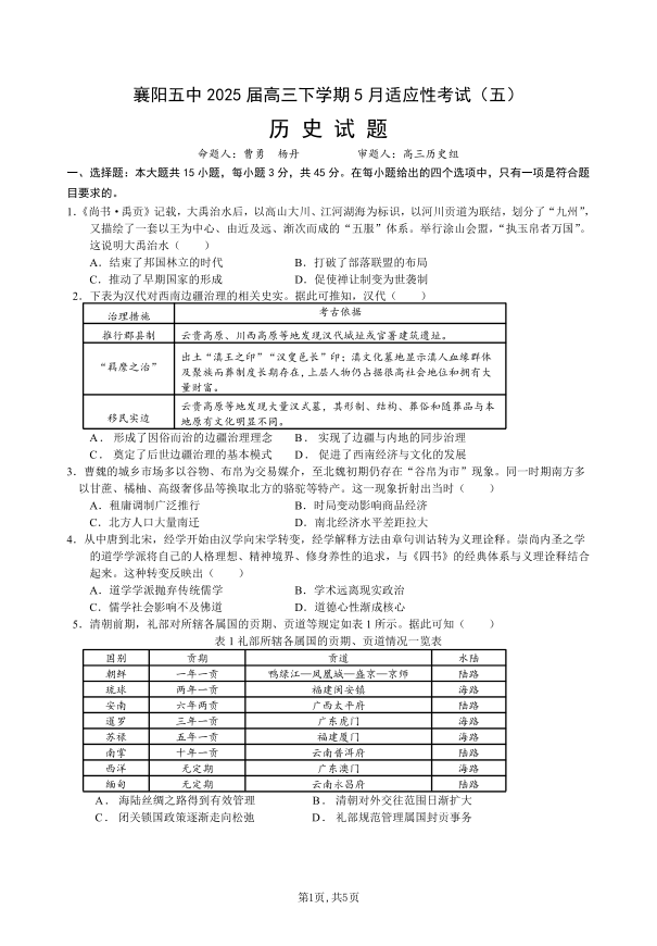 襄阳五中2025届高三下学期5月适应性考试(五)历史.pdf