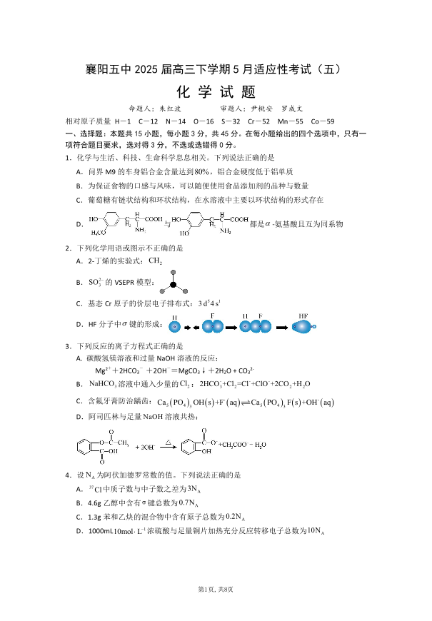 襄阳五中2025届高三下学期5月适应性考试(五)化学.pdf